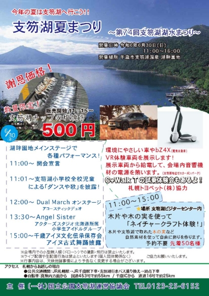 夏まつりでは、アコースティックギター演奏やアイヌ古式舞踏など各種ステージ行事を始め、環境にやさしい自動車の展示や電動バイク試乗体験など、国立公園支笏湖の素晴らしい自然環境を表現したまつりとなっています。