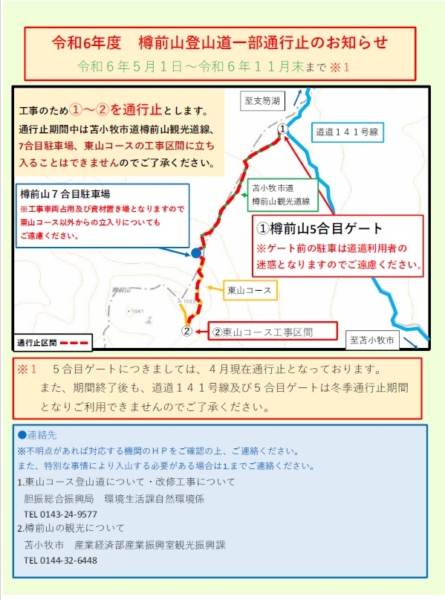 樽前山「東山コース登山道改修工事」に伴う登山道の一部通行止めについて、次のとおりお知らせします。