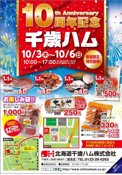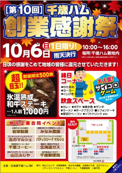 10月6日(日)10時から北海道千歳ハム敷地内にて「第10回千歳ハム創業感謝祭」が開催されます。